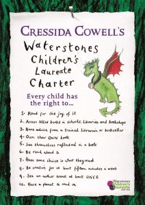 Finally, on my long, thoughtful journey home I read an article by Cressida Cowell. If you don’t follow children‘s book news you may not know that this popular author was appointed Children’s Laureate this month. This wonderful woman is already voicing her support for libraries in our communities and in our schools, including primary schools. Hurrah for Cressida! She has also produced a charter of her most important wishes for her two year tenure. These include reading for the joy of it, accessing new books in schools, libraries and bookshops and owning a book of your own. Her charter if followed would help to enable children to start off on the journey to becoming a reader with happy anticipation rather than a fearful dread of something they find difficult. I hope people listen before it is too late.