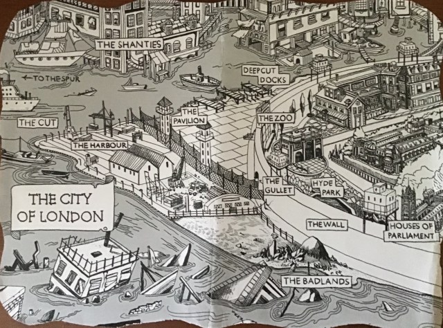 This novel moves from one cliff hanger scene to the next at a rapid pace and has a definite cinematic feel which is to be expected from an author who is a film journalist and has written instalments in The Star Wars: Adventure in Wild Space saga. There are high speed chases, battles in which characters are disposed of in a violent manner and moments of high tension. Now I have to confess this would not be my usual reading fare and it was initially the brilliant map by Jensine Eckwall which drew me in. Maps in books are always a bonus for me and the world depicted in this one intrigued me. Once I started reading, the vivid descriptions made the world in the map come to life and I felt that there was almost a Dickensian atmosphere to The Shanties. Then there are the characters. Kara is a female character around whom, as the story progresses, the plot centres and she is a brave, almost fearless young woman, outspoken and yet caring towards Joe her younger and more naive friend. I found Joe a likeable character with a caring attitude despite his extremely difficult childhood. Having picked the book up not sure what to expect I kept reading because I found that within a few pages I wanted to know what happened to Kara and Joe and became involved in their world and their predicament.