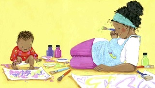 We meet Zeki and his mummy first thing in the morning as she wakes him with a game of peek-a-boo and follow them through their day until bedtime when Zeki curls up with mummy for cuddles and a story. Each double page spread features an activity that will be familiar to a little person and will encourage them to engage, look and listen. There is den building with cushions, a trip to baby gym, a bike ride, lunch and painting. All of this is presented as being great fun and there are smiles on every page; encouraging both the mum who is reading it and the toddler listening.