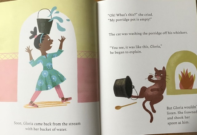 Gloria’s Porridge is an appealing picture book; the colourful front cover full of smiles is tempting and the text has a lively, bounce to it which would make it fun to read aloud. Like many traditional tales it has a message to impart to its readers and listeners. Young children will see the repercussions from one small act and how it can cause problems for others. This is a tricky topic for them to understand but in this form is easier for them to relate to. There is also the opportunity to talk about sharing what we have with others.
