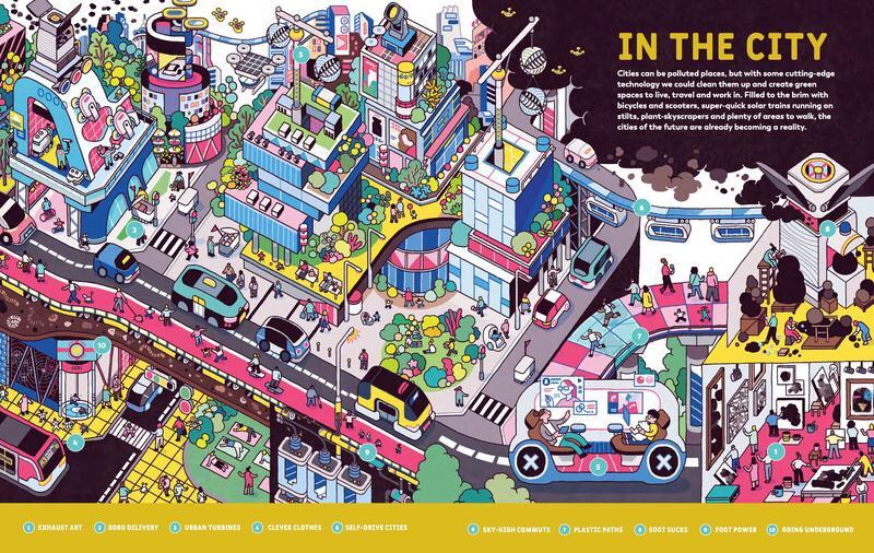 The tone is light hearted at times but the astonishing amount of facts and detail included and the scientific language used make this a valuable source of information. There is a helpful glossary included at the end providing definitions of the more difficult vocabulary. The broad range of topics included include alternative sources of energy, environmental food alternatives, and inventions inspired by nature. Much of the information is conveyed within the eye catching illustrations by Jisu Choi and these invite the reader to linger and examine them in detail. The vibrant use of colour and the modern infographic style will tempt many readers to explore this book.