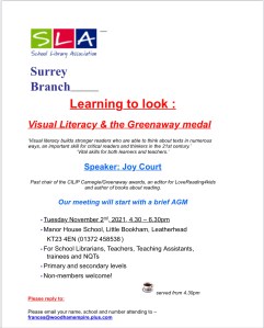 But first, in my role with the Surrey Branch of the School Library Association I would like to highlight our branch meeting being held on 2nd November from 4.30pm – 6.30pm. We are delighted to welcome Joy Court as our visiting speaker. Joy is well known to children’s book lovers in her roles as former Chair of the Carnegie and Greenaway Medal Judges, Expert Book Reviewer for LoveReading4Kids and her involvement with both UKLA and CILIP Youth Libraries Group. She will be talking about the importance of Visual Literacy for all age groups plus the benefits of shadowing the Greenaway Medal. Full details are given in the flyer shown and we would love to see you there. School librarians, teachers, TAs, all very welcome so please do get in touch with me if you have any questions.
