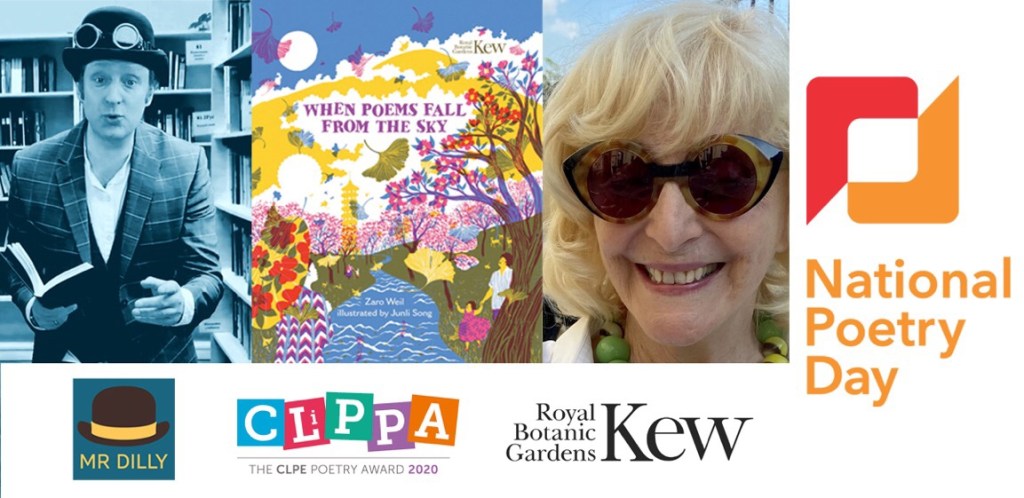 National Poetry Day 2021 for Schools – Mr Dilly Meets Zaro Weil – Free online event for schools. Mr Dilly Meets CLiPPA Poetry Prize Winner Zaro Weil to discuss her stunning new collection When Poems Fall From the Sky. Followed by the premiere of Mr Dilly’s Top of the Poems, a fun, fact filled ten minute short film introduction to some of the world’s best children’s poets and poems. Thursday 7th October 11.00am -11.40am.