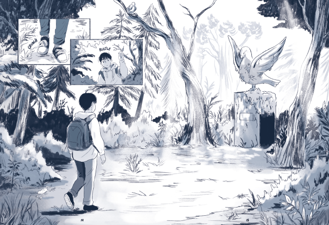 My biggest challenge when John handed me the script was figuring out how to translate everything visually. Ditching Saskia is my first graphic novel, and prior to this I didn’t have any experience in making longer form comics. So, I approached it the only way I knew how: imagining the story as a film and that I was the cameraman following these characters in their day-to-day lives.